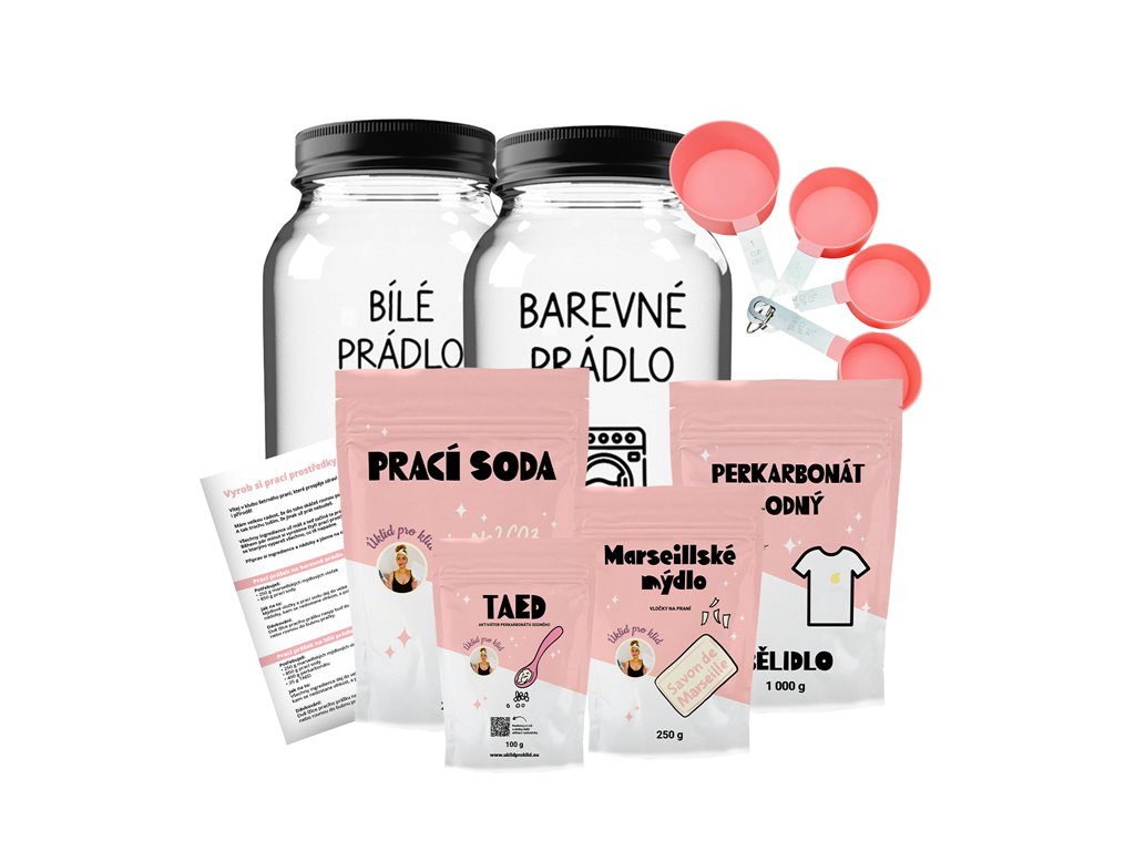 Výhodný balíček obsahuje sadu na výrobu pracieho prášku na bielu, farebnú a tmavú bielizeň a ďalších pomocníkov, ktorí ti pranie parádne uľahčia: praciu sódu, marseillské mydlo, perkarbonát sodný, TAED, 2 sklenice na hotový prášok, sadu odmeriek a návod na výrobu pracích prostriedkov .