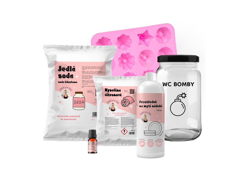 Aby som ti čo najviac uľahčila výrobu WC bômb, pripravila som balíček, ktorý obsahuje všetko potrebné: silikónovú formu na WC bomby, z ktorej vytvoríš 12 rôznych tvarov, jedlú sódu, kyselinu citrónovú, prostriedok na umývanie riadu, esenciálny olej a sklenenú nádobu na uskladnenie hotových bômb.
