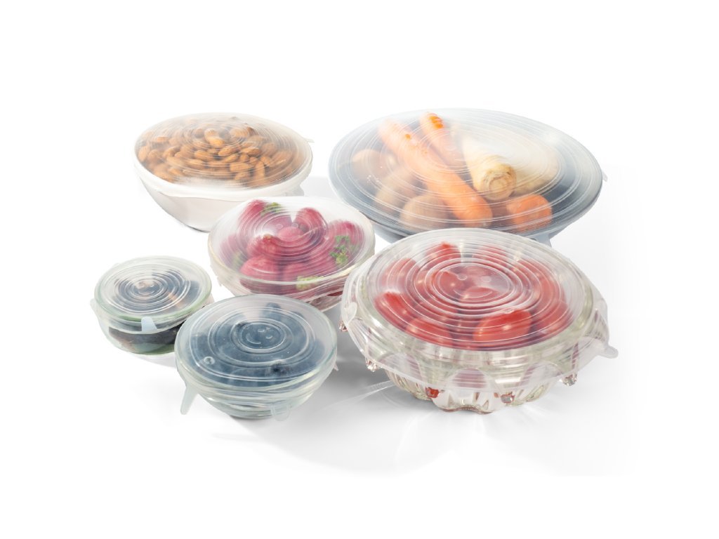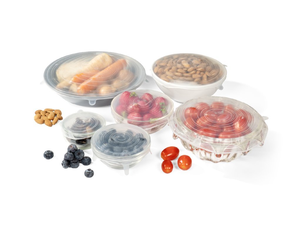 Praktická sada priehľadných znovupoužiteľných silikónových viečok na uchovanie čerstvých potravín.