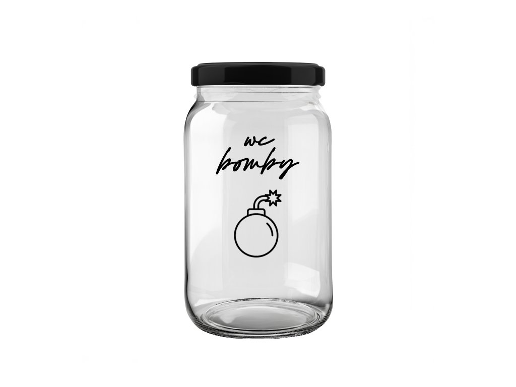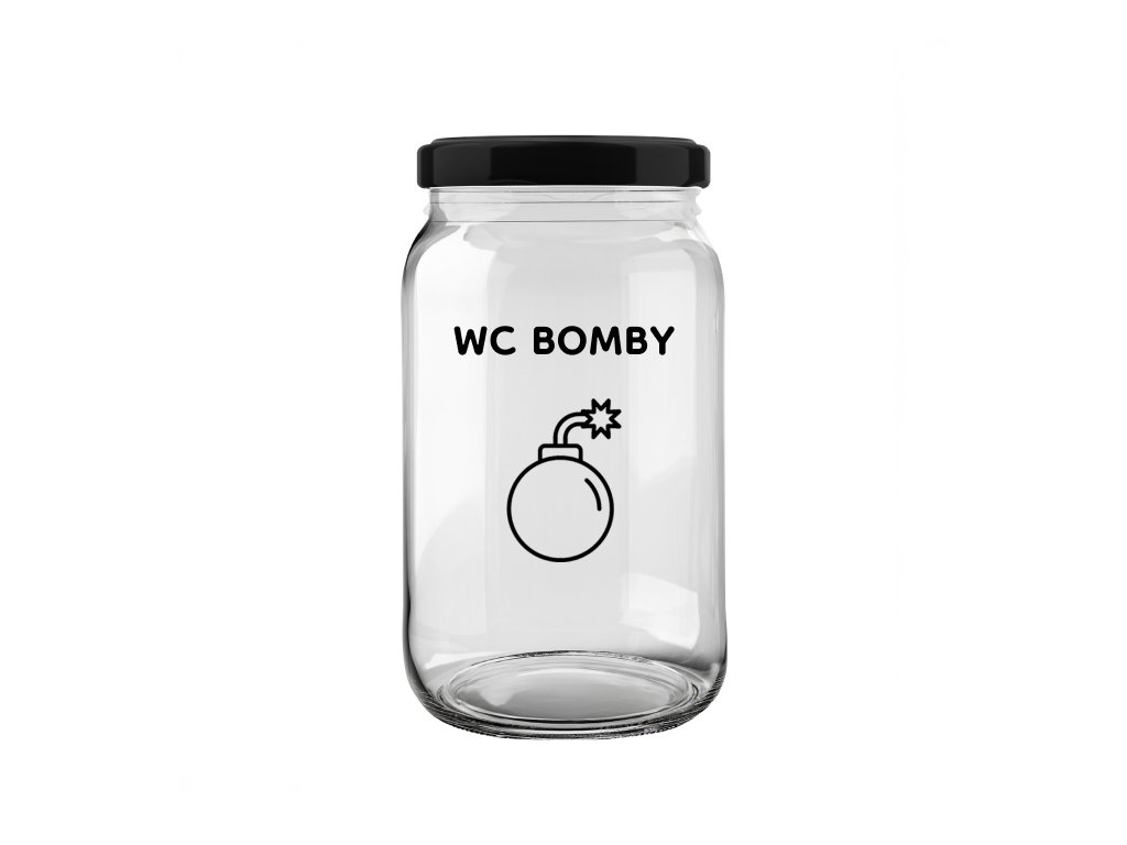 Sklenená nádoba s nápisom "WC bomby" s objemom 0,9 litra - pre bezpečné uloženie a krásne zladenú kúpeľňu.