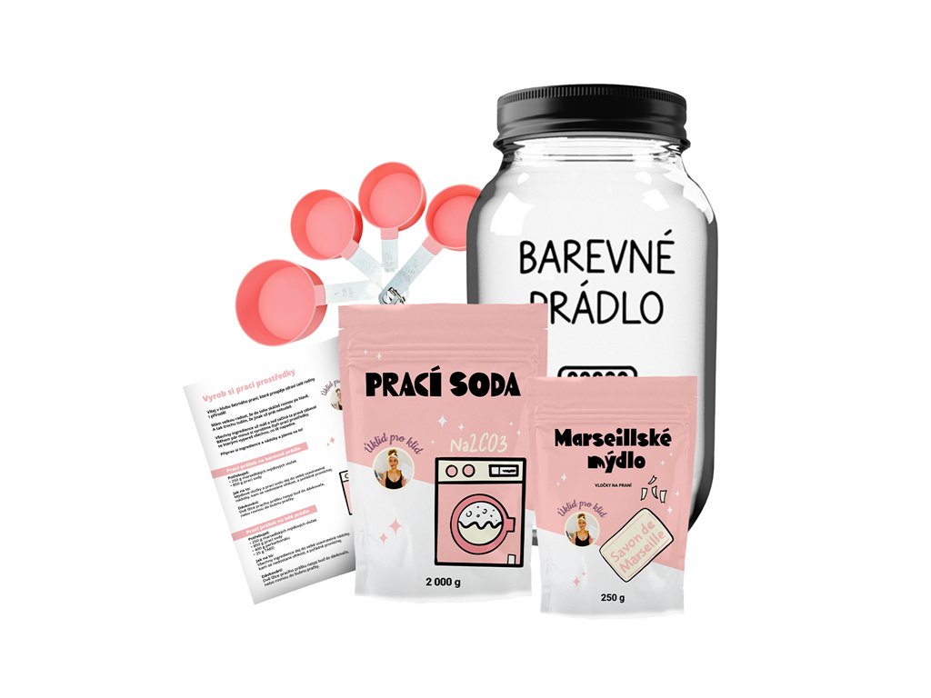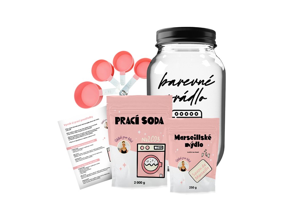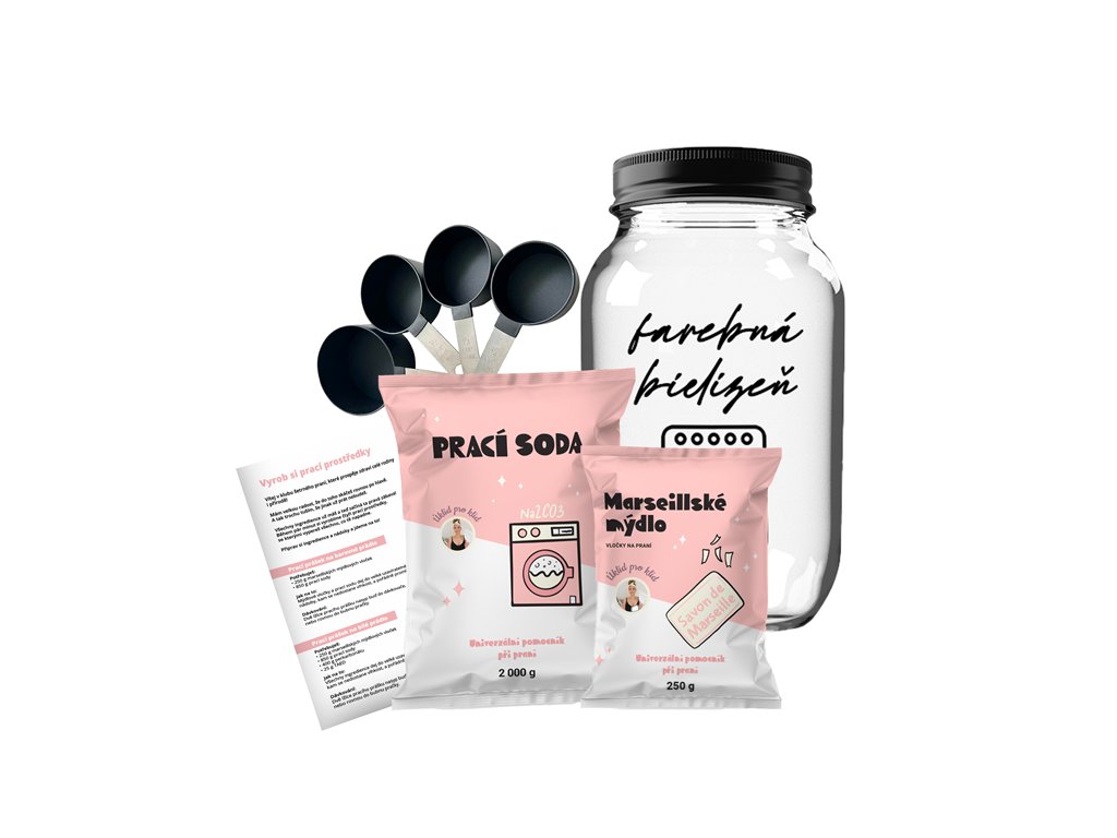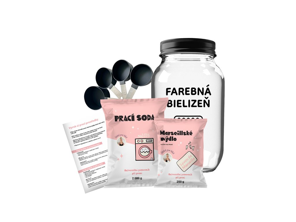 Balíček obsahuje sadu na výrobu pracieho prášku na farebnú a tmavú bielizeň: praciu sódu, marseillské mydlo, pohár na hotový prášok s nápisom farebnú bielizeň, sadu odmeriek a návod na výrobu pracieho prášku.