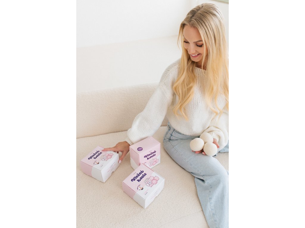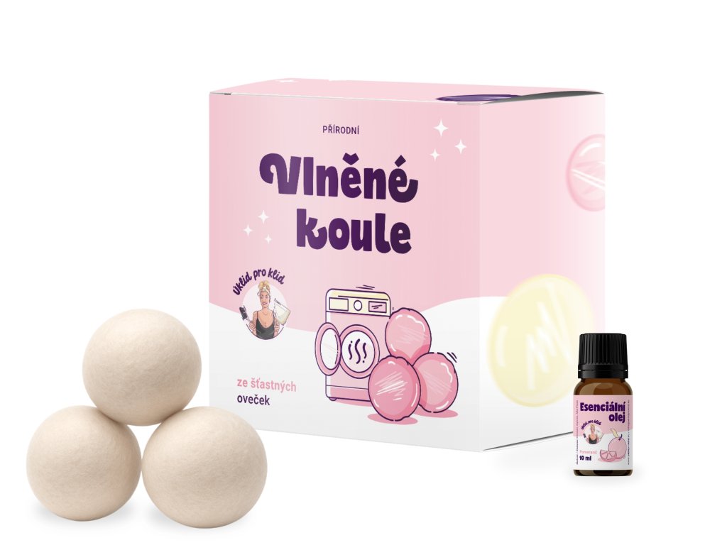 Loptičky z ovčej vlny do sušičky, balené v darčekovej škatuľke. Môžete si vybrať buď samotné loptičky, alebo v kombinácii s esenciálnym olejom.