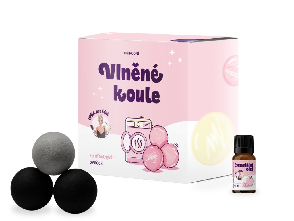 Guľôčky vlny z ovčej vlny do sušičky, balené v darčekovej škatuľke. Môžete si vybrať buď samotné guľôčky, alebo v kombinácii s esenciálnym olejom.